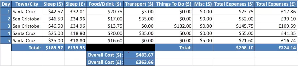 The majority of my spending came from the main categories I’ve already broken down, with just an extra $17 (£12) going towards some fun and miscellaneous bits. One splurges was a $12 Happy Hour on San Cristobal, a couple of rounds of cocktails shared with someone I’d met earlier on at Kicker Rock, while we sat watching the sun dip below the horizon. Moments like that are priceless. I also picked up a $5 fridge magnet (a little tradition of mine from every trip).